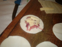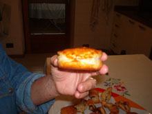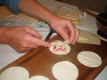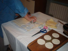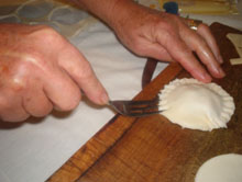 Mettere al centro un po' di cipolla dolce di Tropea e il pecorino e ricoprire con un altro tondo, come per creare un grosso raviolo e premere i bordi con i rebbi di una forchetta.