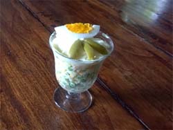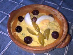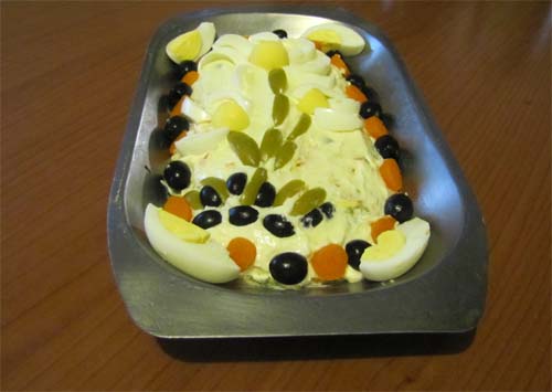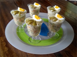 Disporre in un piatto da portata o in bicchieri individuali, ricoprire con la maionese rimasta e decorare con spicchi d'uovo, filetti di oliva verde o nera, olive intere e rondelle di carota.