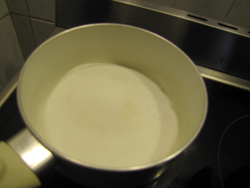 Cuocere a bagnomaria sulla fiamma, coprendo lo stampo con un coperchio, perché non entri l'acqua in ebollizione, oppure in forno a 180 gradi fino a quando si sarà rappreso