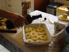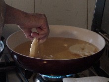 Immergere le fette di mela aromatizzate nella pastella e friggerle in olio di semi ben caldo, ma non troppo