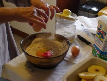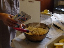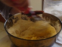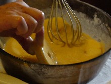 Mescolare zucchero, farina, un pizzico di sale, due uova intere e latte sufficiente a creare una pastella consistente, ma non troppo