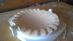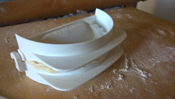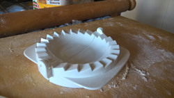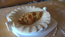 Stendere piuttosto fine la pasta, fare dei cerchi di cm. 10 con il coppapasta e, aiutandosi con un raviolatore, fare i ravioli, con dentro un'abbondante noce di ripieno