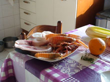 I crostacei devono essere privati del budellino nero, incidendoli sul dorso e poi devono cuocere per 5 minuti insieme a tutto il resto.