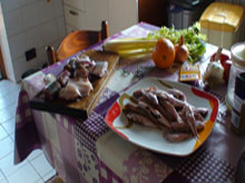 Presentazione: mettere la base in tegamini di coccio, immergervi i pezzi di pesce e i crostacei e servire con i crostini agliati e le due salse.