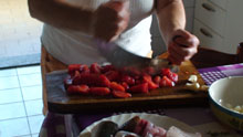 Rosolare a fuoco vivo in olio aglio e cipolla tritata fine e pomodori senza buccia e semi e tritati grossolanamente.