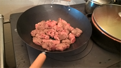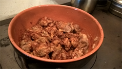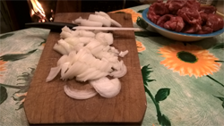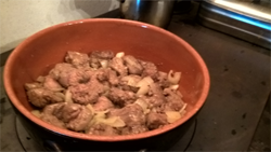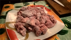Tagliare a dadi di 3 cm. la corona di manzo (bue o vitellone) e insaporire nella cipolla