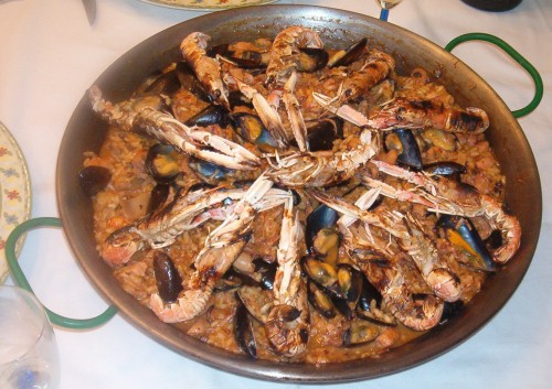 A cottura ultimata, decorate il paellero con le cozze contenute in mezzo guscio e con gli scamponi o i gamberoni