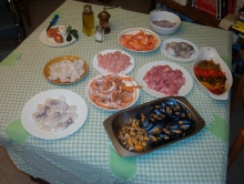 Unite calamari, gamberetti, moscardini, pollo e coniglio e le due foglie di alloro al fondo con cipolla, bagnate con il brodo di dado e fate cuocere a fuoco lento per 30 minuti circa