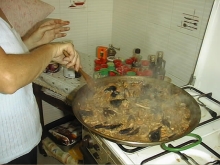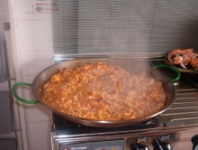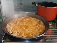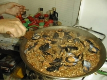 Mettete sul fuoco il paellero e fatevi riscaldare ½ bicchiere di olio d'oliva, nel quale tostatee per 10 minuti il riso, unendo il liquido degli ingredienti poco per volta e, se serve, altro brodo