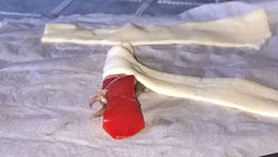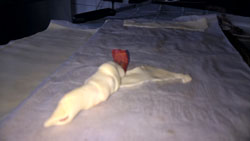 Avvolgere ogni striscia di sfoglia attorno a un filetto di peperone e acciuga in modo da formare un
