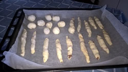 Disporre i salatini distanziati in una teglia rivestita con carta da forno