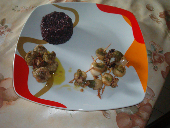 Nel frattempo fare cuocere il riso Venere (30/40 minuti), scolarlo e farlo passare brevemente in padella con poco burro.
