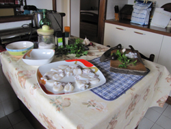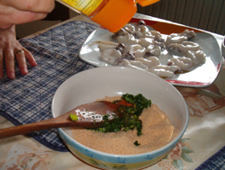 Tritare abbastanza finemente alcune di loro (sacca e tentacoli) e mettere il trito in una ciotola.