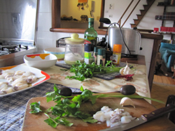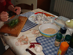 Sminuzzare finemente a coltello il prezzemolo, gli spicchi d'aglio (volendo si possono spremere), le foglioline di maggiorana, di timo e di origano, il peperoncino piccante (nella quantità desiderata) e aggiungerli al trito di tentacoli.