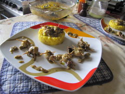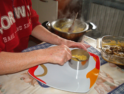 Servendosi di un coppapasta, creare nel piatto individuale una torretta con il riso prescelto, affiancarla con seppioline, sughetto e polpettine.