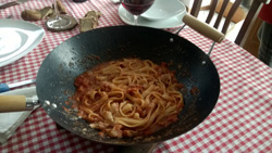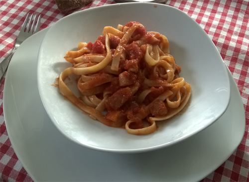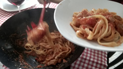 Mettere nella padella dove è rosolato il guanciale i pomodori freschi, privati della buccia e dei semi, tagliati a filetti o i pelati tagliati grossolanamente.