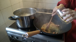Fare rosolare a fuoco vivo e sfumare con il vino bianco.