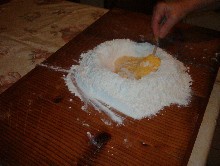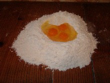 Mettere a fontana sulla spianatoia la farina e al centro rompere le uova
