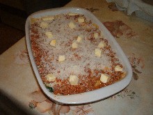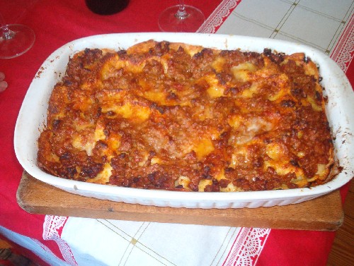 Per montare la teglia, mettere sul fondo 3 o 4 cucchiai abbondanti di sugo, sovrapporre le sfoglie di pasta all'uovo, cospargerle di sugo e parmigiano