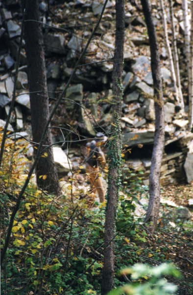 | Dall'alto si vedono, tra alberi di betulla e di faggio, cumuli di pietre e un 'picapere' che si accinge a lavorare: lo gneiss lamellare verrà trasformato in 'lose' dal cavatore, solitamente un agricoltore che è costretto a svolgere un'attività artigianale per sopravvivere. Per alcuni agricoltori, il lavoro nella cava è un arrotondamento del reddito, per altri è l'unica possibilità di sussistenza. Tuttavia, il vero 'soggetto' della cava non è l'uomo, bensì il filone di pietra,che determina l'avanzamento o l'abbandono del lavoro.