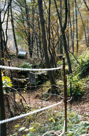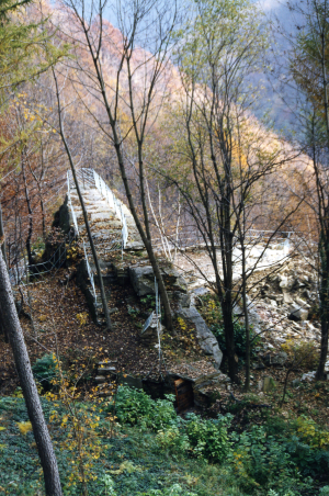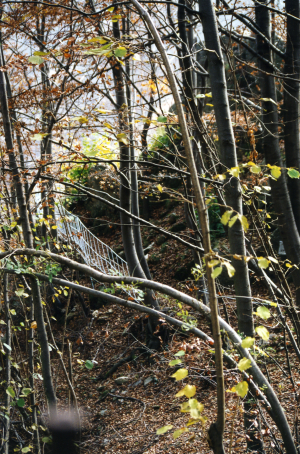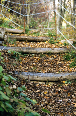 Per scendere nella cava si utilizza un ripido percorso costituito da tronchi infissi nel terreno, protetto da barriere metalliche e immerso nella vegetazione |
