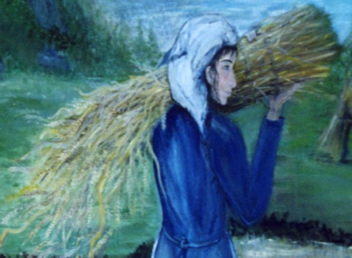 ... portando un fascio d'erba per i suoi animali...