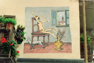 "Il povero Pinocchio, che aveva sempre gli occhi fra il sonno, non s'era ancora avvisto dei piedi, che gli si erano tutti bruciati: per cui appena sentì la voce di suo padre, schizzò giù dallo sgabello per correre a tirare il paletto; ma invece, dopo due o tre traballoni, cadde di picchio tutto lungo disteso sul pavimento."Si produce un enorme trabusto e Geppetto chiede spiegazioni al figlio il quale non sa che farfugliare di qualcuno che gli ha mangiato i piedi, forse il gatto, ![]() visto che sta giocando sul pavimento con alcuni trucioli!Geppetto pensa sia una delle tante bugie del burattino e, poichè non gli crede, si arrampica lungo il muro ed entra in casa dalla finestra. Tra il dire e il fare... Avrebbe voluto punire Pinocchio per tutte le sue monellerie, ma di fronte a quei piedi carbonizzati, prova grande pietà e, invece di sonori ceffoni, ricopre il figlio di baci e carezze. |