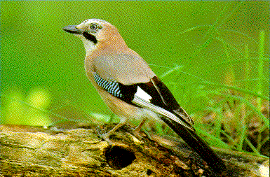 Misura circa 35 cm. Ha una macchia nera, simile ad un mustacchio, che parte dalla base del becco, nero e robusto; é riconoscibile per un ciuffo ben distinto, erigibile, sulla testa, costituito da penne bianchicce striate di nero. Il suo corpo é color bruno-vinato più intenso dorsalmente che sotto; ha la gola, il groppone ed il sottocoda bianchi; la coda nera ed ali colorate di nero, di bianco, di bruno e provviste inoltre di una zona coperta dalle ben note penne a fasce trasversali nere ed azzurre.