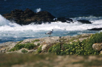 Solitario gabbiano tra gli spruzzi di schiuma