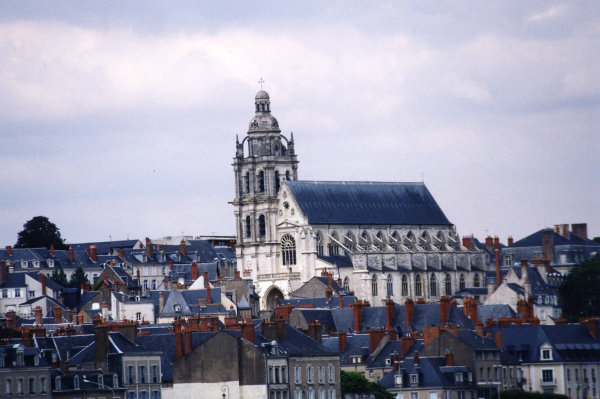 Comignoli di mattoni rossi spiccano sui tetti grigi d'ardesia dominati dal profilo della Cathédrale St-Louis