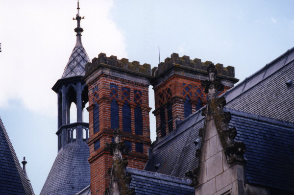 Due camini di rossi mattoni creano un effetto di contrasto forte con l'ardesia dei tetti